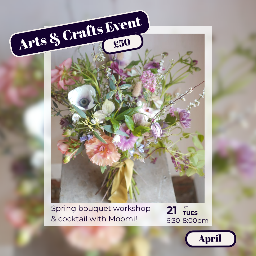 Join Moomi Botanicals for a relaxed spring bouquet workshop where Lyndsay will guide you through creating your own beautifully hand-tied, seasonal British flower arrangement; flowers, creativity and a glass in hand.